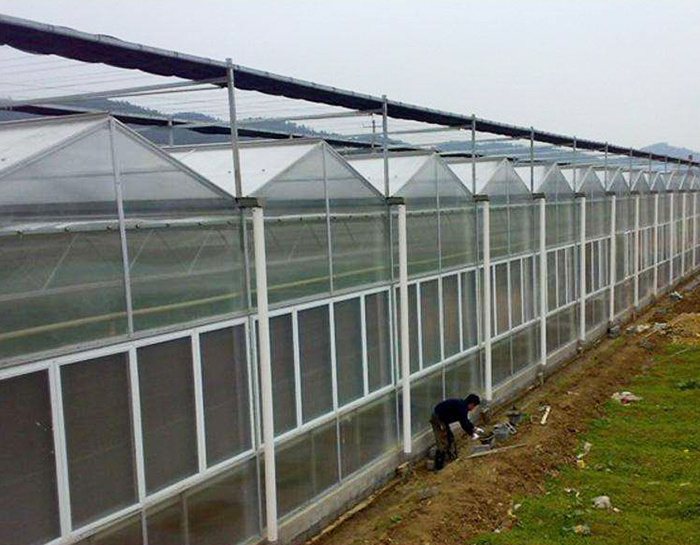 顶部覆盖采用防紫外线防结露聚碳酸酯中空板,四周墙体按常规要求为聚碳酸脂中空板或采用玻璃,根据地区气候条件的差异,在一些寒冷地区(如东北等地),北墙体可采用保温复合板,还可以安装推拉窗,增加温室通风面积。